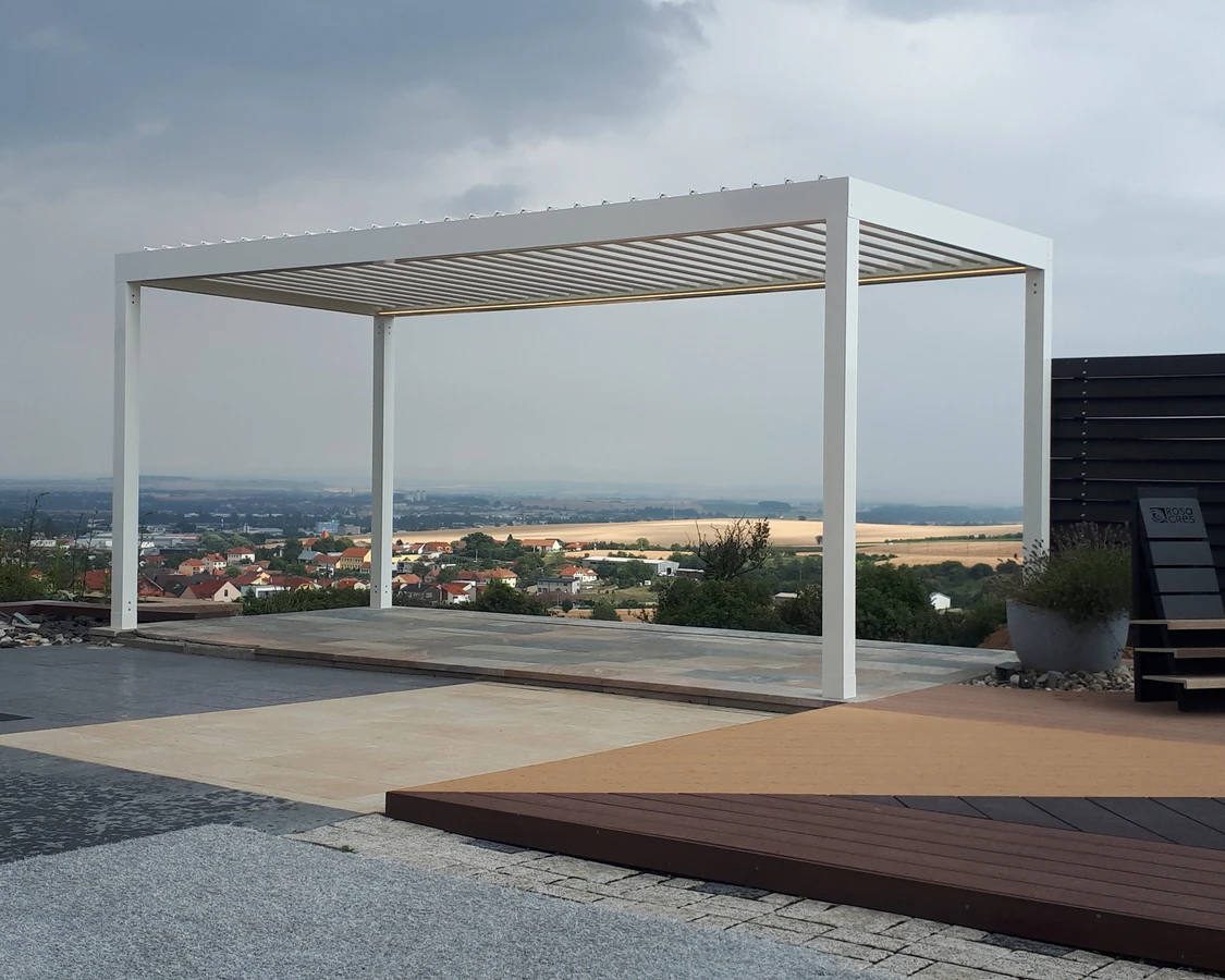 Srdcem bioklimatické pergoly jsou hliníkové lamely, které lze natáčet podle aktuální potřeby. Díky tomu můžete: