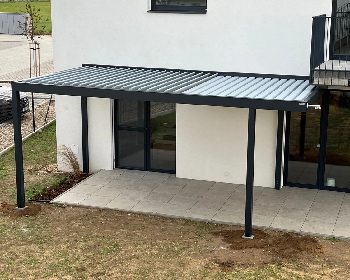 Další zajímavostí této realizace je vybavení pergoly dvěma samostatnými motory. Díky nim lze každou sekci lamel ovládat nezávisle – například jednu část zcela otevřít a druhou ponechat zastíněnou. To poskytuje uživatelům maximální komfort a flexibilitu při používání pergoly během dne.